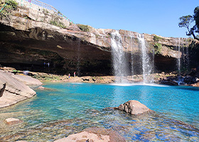 - Highlights: A breathtaking double-tier waterfall flowing into a turquoise-blue natural pool